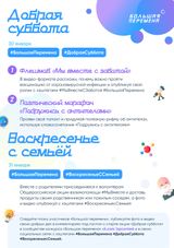 30 января в сообществе Всероссийского конкурса для школьников «Большая перемена» социальной сети ВКонтакте (https://vk.com/bpcontest) пройдет традиционная Акция «Добрая суббота». В воскресенье, 31 января, школьники и их родители в рамках акции «Воскресенье с семьей» смогут присоединиться к волонтерам Общероссийской акции взаимопомощи #МыВместе. Фото и видеоматериалы проведенных мероприятий школьники смогут опубликовать в своих социальных сетях и сообществе конкурса «Большая перемена» с хэштегами #ДобраяСуббота и #БольшаяПеремена